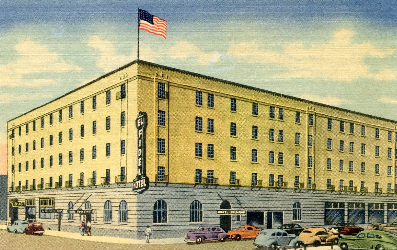 Albuquerque New Mexico NM, vintage 1940''s linen postcard, El Fidel Hotel, cars