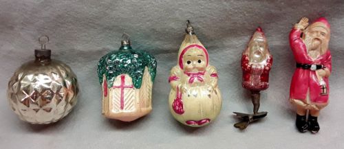 Title (ebay affiliate link): ANTIQUE GLASS CHRISTMAS ORNAMENTS BELSNICKLE BABY AND PURSE CHURCH WITH BERRIES