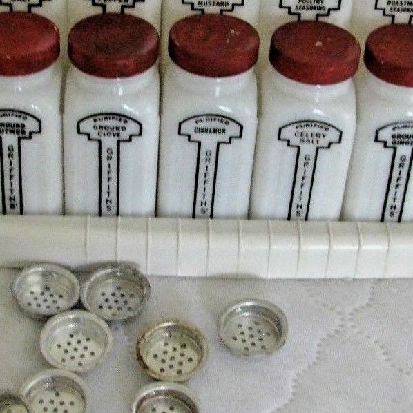 Title (ebay affiliate link): 12 Vintage Griffith''s Milk Glass Spice Jars in original holder