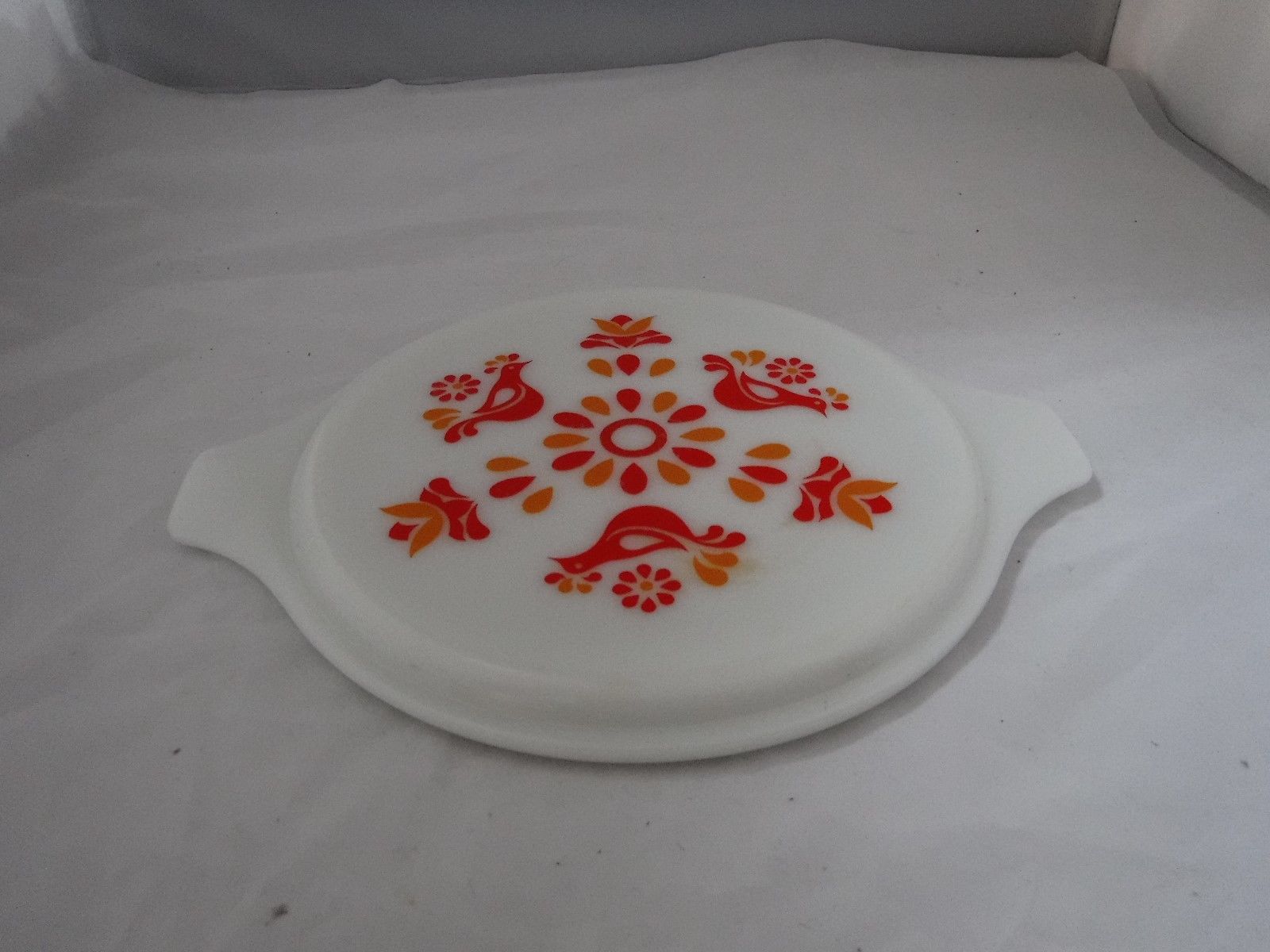 Title (ebay affiliate link): PYREX FRIENDSHIP BIRD Milk Glass Casserole 11" Lid Cover Red Orange 25-C-21