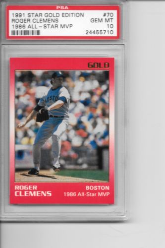 Title (ebay affiliate link): 1991 STAR CO. GOLD ROGER CLEMENS #70 PSA 10 GEM MINT POP 1 WOW