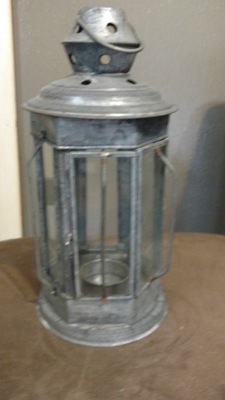 Title (ebay affiliate link): primitive galvanized metal and glass lantern. tealight candle. Hoop to hang.