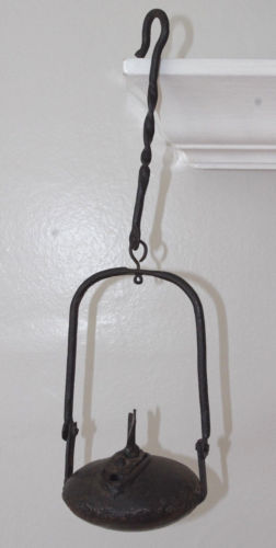 Title (ebay affiliate link): ANTIQUE PRIMATIVE WROUGHT IRON OIL LAMP / BETTY LAMP/ MINERS LAMP