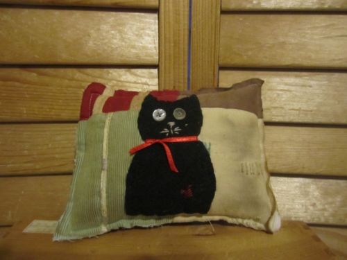 Title (ebay affiliate link): Primitive Quilted pillow tuck -black wool cat - red/green/brown - stitched face