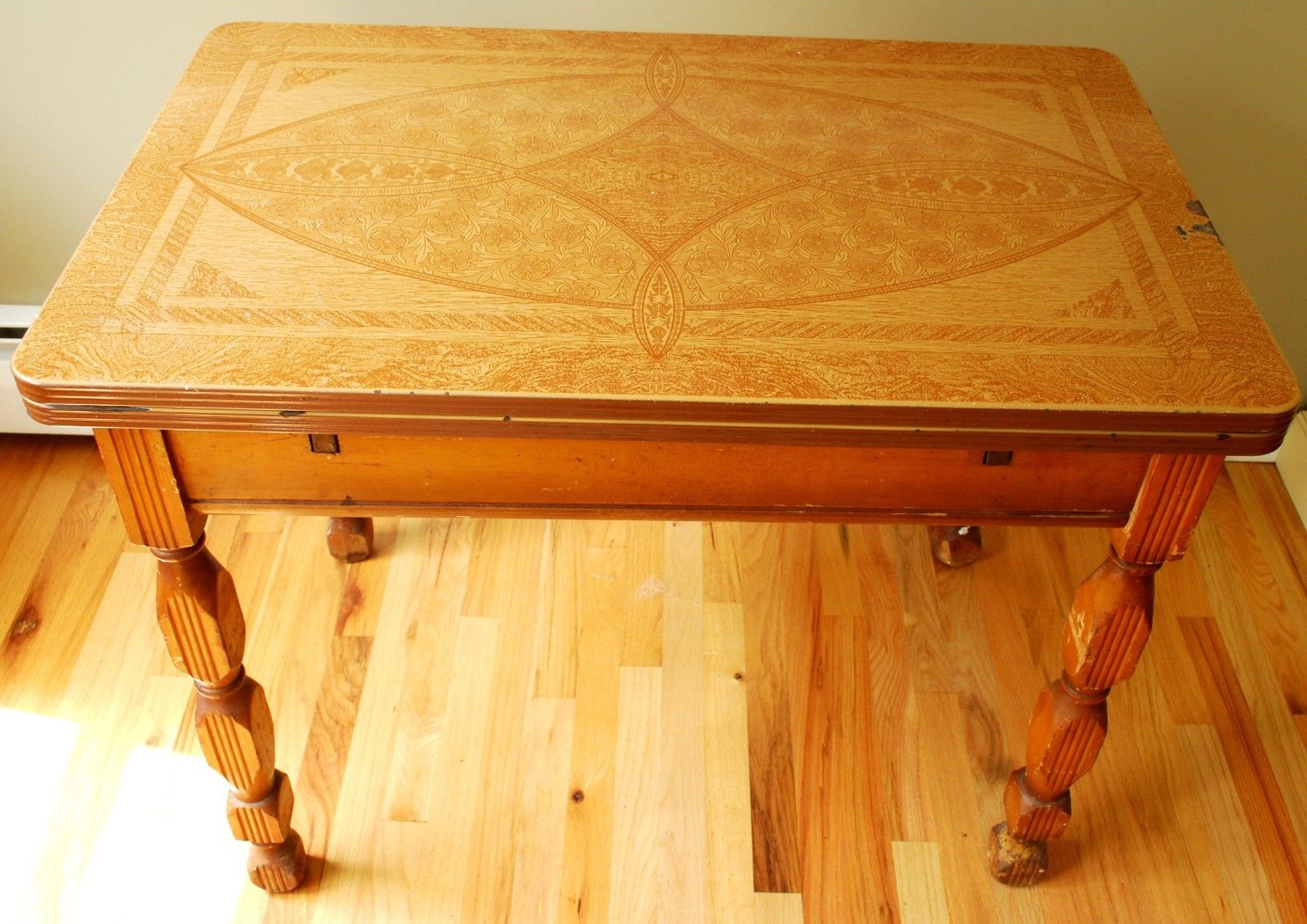 Title (ebay affiliate link): VINTAGE ART DECO PORCELAIN ENAMEL KITCHEN TABLE- NICE TABLE TOP DESIGN!