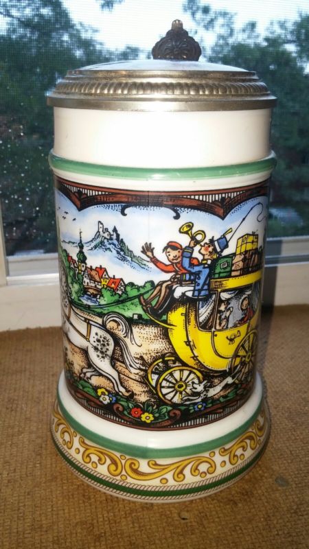 ORIG. BMF BIERSEIDEL BEER STEIN MILK GLASS CARRIAGE SCENE W. GERMANY