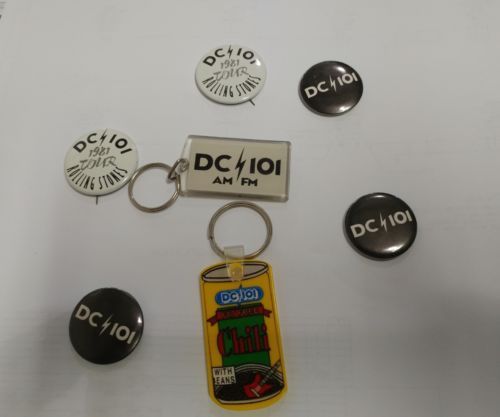 Title (ebay affiliate link): Vintage Rock N Roll pins. 5 pins 2 key chains DC101 Rolling Stones
