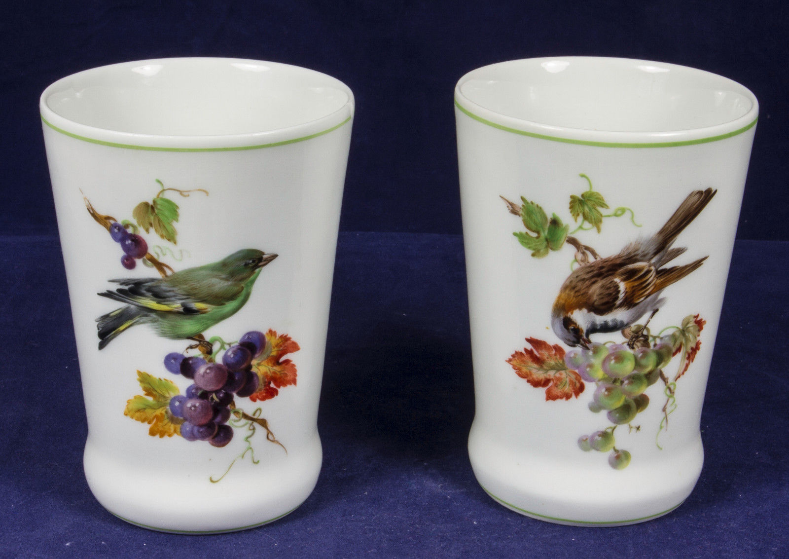 Title (ebay affiliate link): 2 Porcelain Meissen Tumblers Birds on Grape 4" Marked Numbered Germany 1945-47