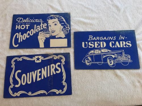 3 Vintage 1950s Cardboard Signs: Hot Chocolate Used Cars, Souvenirs 11x7