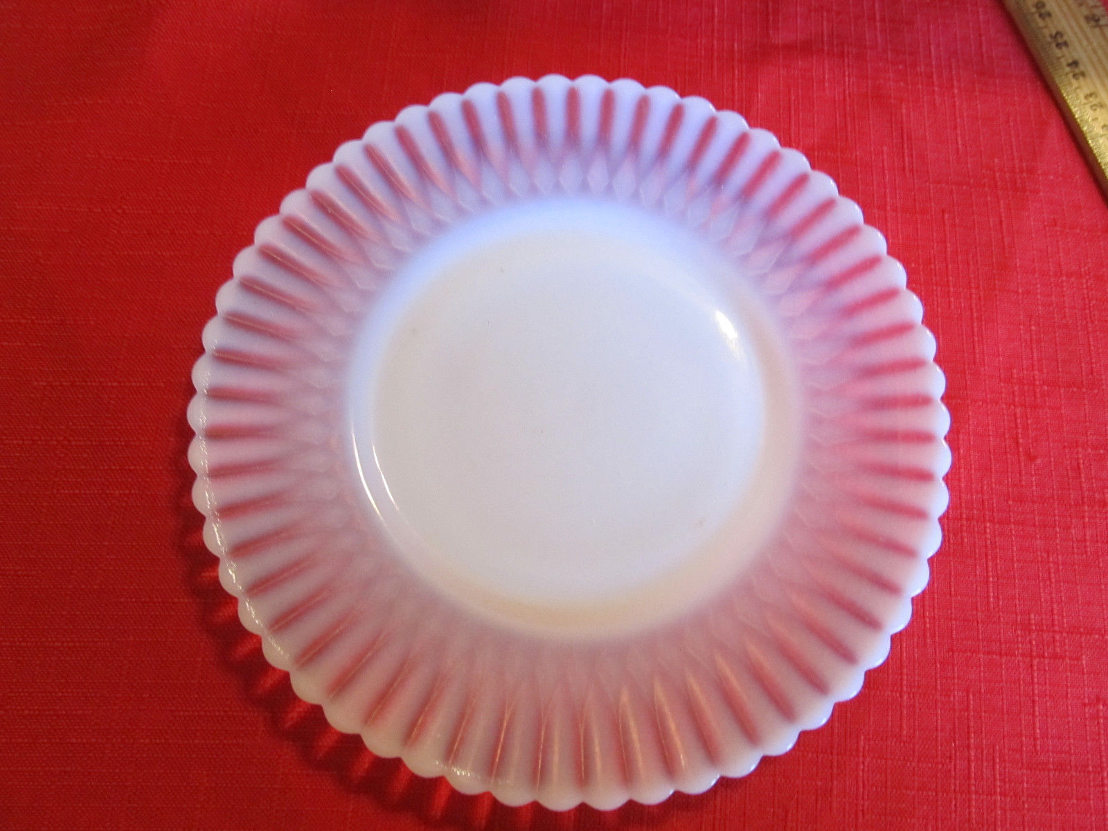 Title (ebay affiliate link): Two McBeth Evans Petalware white glass, opaque dessert plates 6" dia.