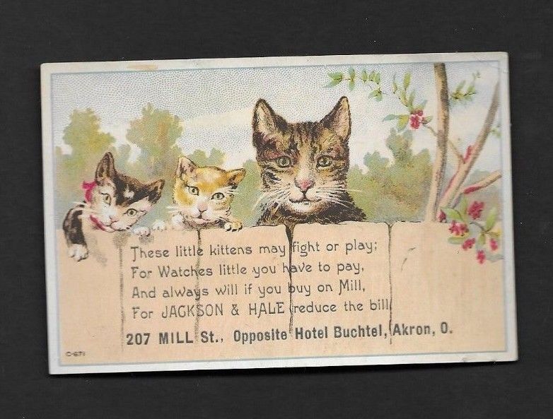 Trade Card Akron OH Jackson & Hale Jeweler Opposite Hotel Buchtel Cats *AT32