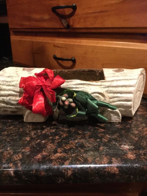 Title (ebay affiliate link): Vintage Christmas Yuletide Paper Mache LOG Planter w/ Bow, Pinecones, Mica