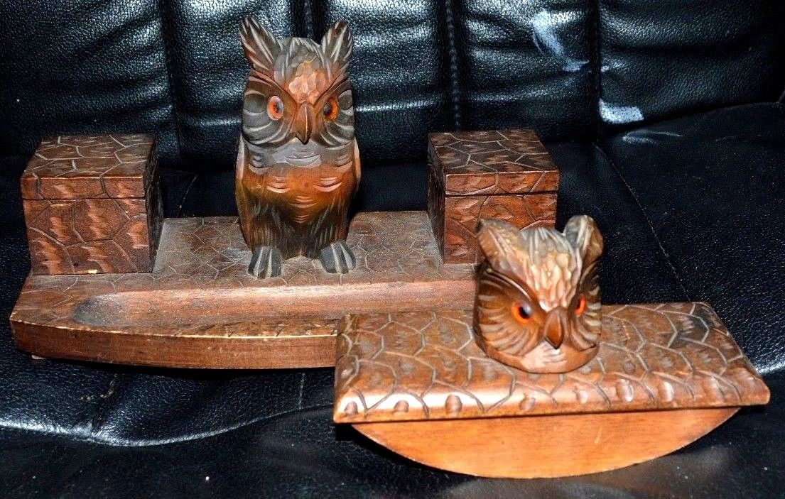 Title (ebay affiliate link): BLACK FOREST GERMAN ANTIQUE INKWELL & PLOTTER CARVED OWLS GLASS EYES