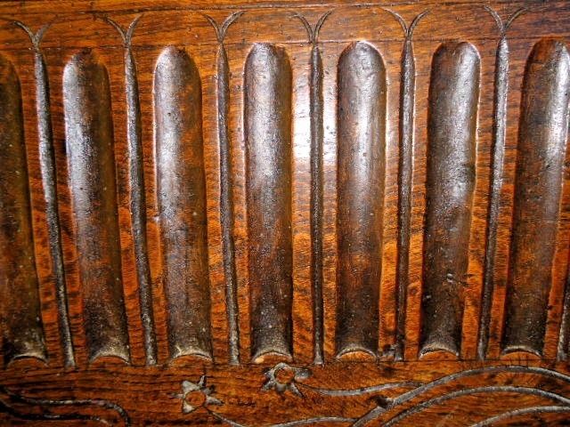 18TH CENTURY SMALL ELM PANEL ,CARVED NULLED AND FLOWER HEAD,END OF COFFER