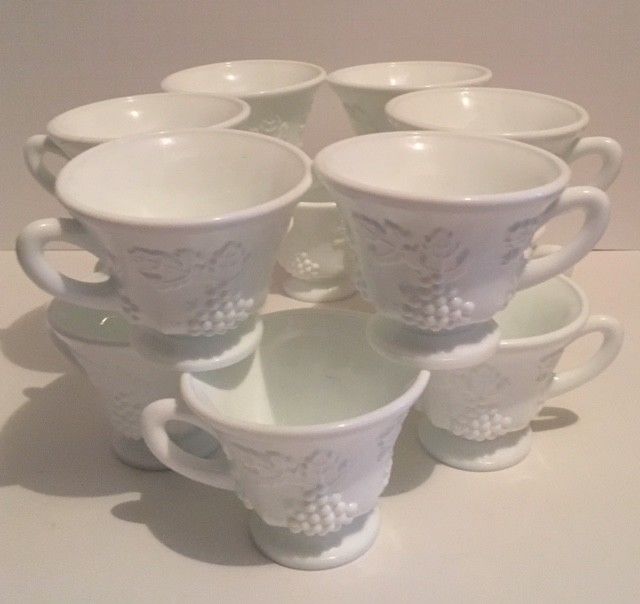 Title (ebay affiliate link): White Milk Glass WESTM0RELAND With Grape Pattern- Set Of 12 Tea Cups