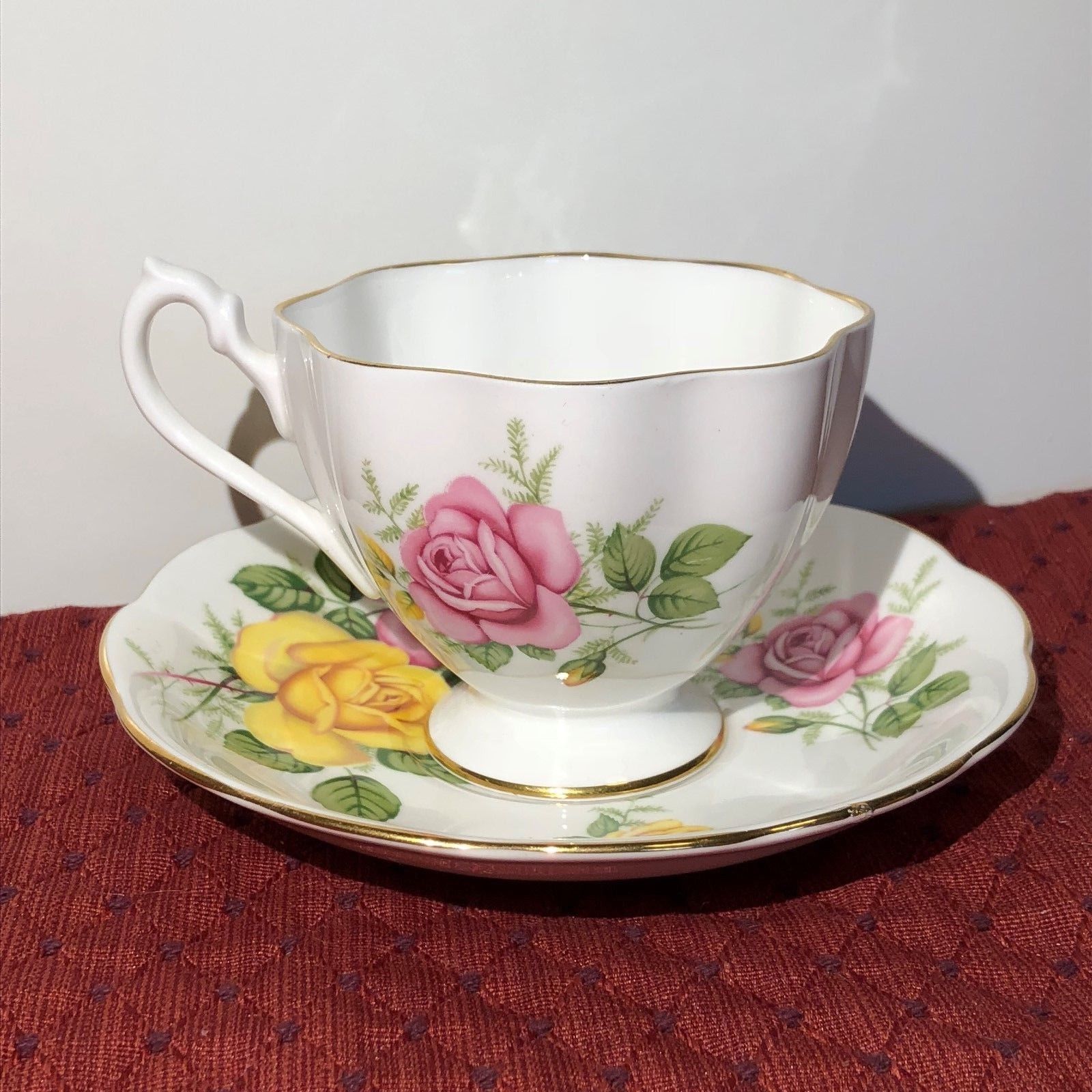 VINTAGE Fine Bone China England Tea Cup and Saucer ~ Pink/Yellow Roses GOLD TRIM