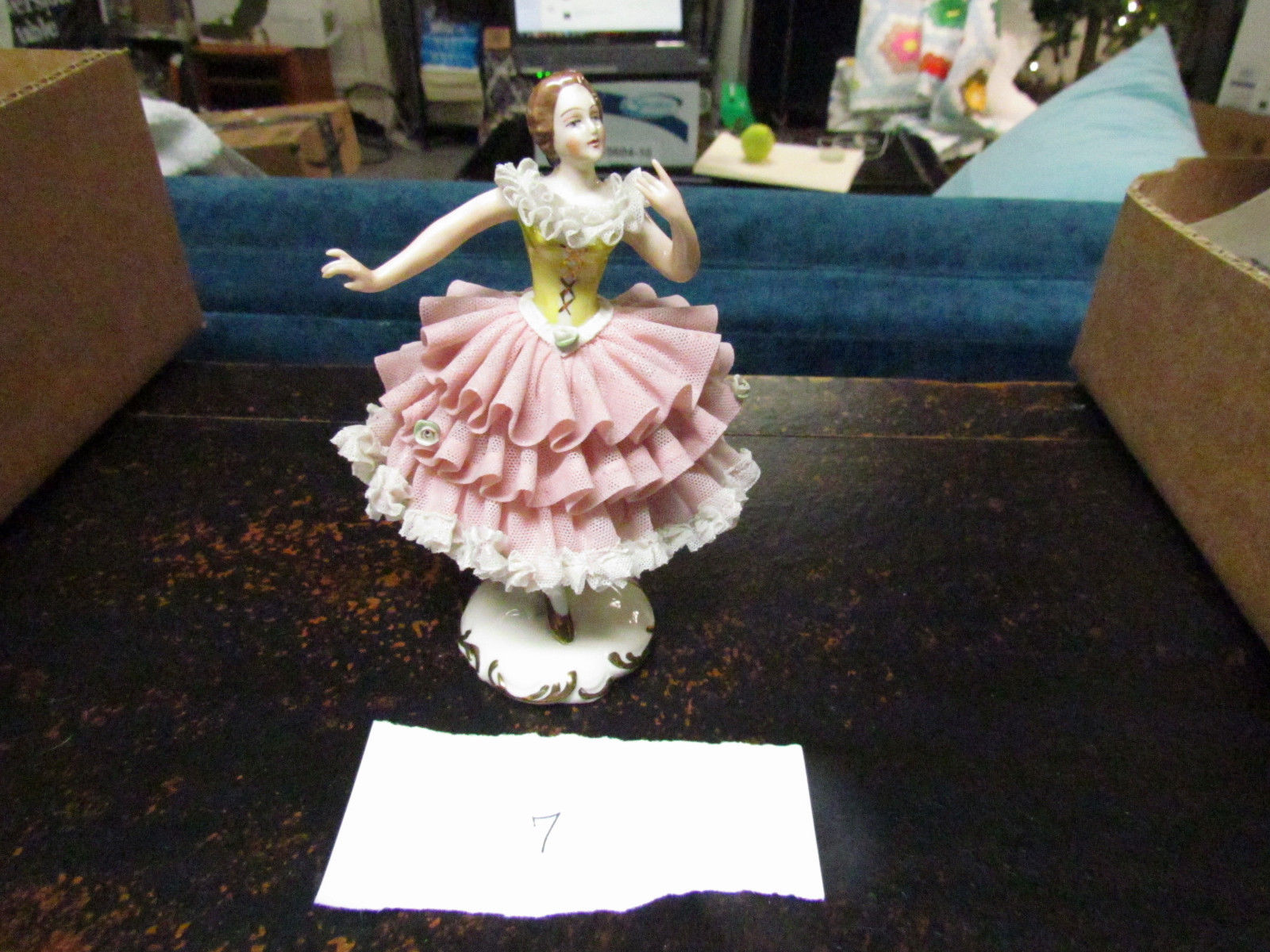 Title (ebay affiliate link): 5 1/2" Tall Porcelain Lace Figurine Made in Germany Dresden Art Gold Trim #7