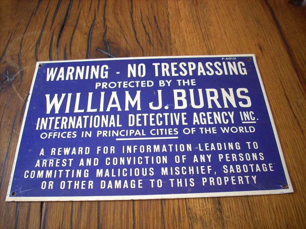 Title (ebay affiliate link): NO TRESPASSING metal sign- William J Burns Detective Agency-very nice