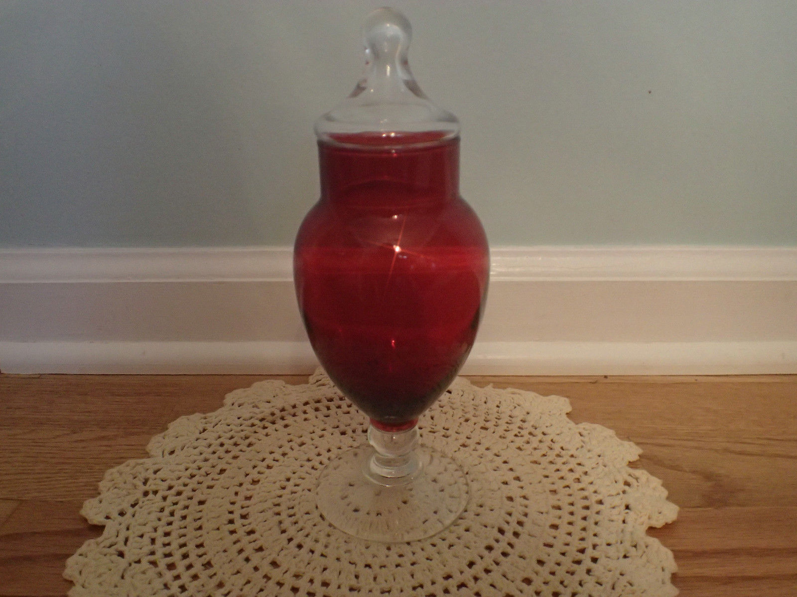 Title (ebay affiliate link): Vintage (Early 1960s) Ruby Red Glass Apothecary Jar with Clear Lid
