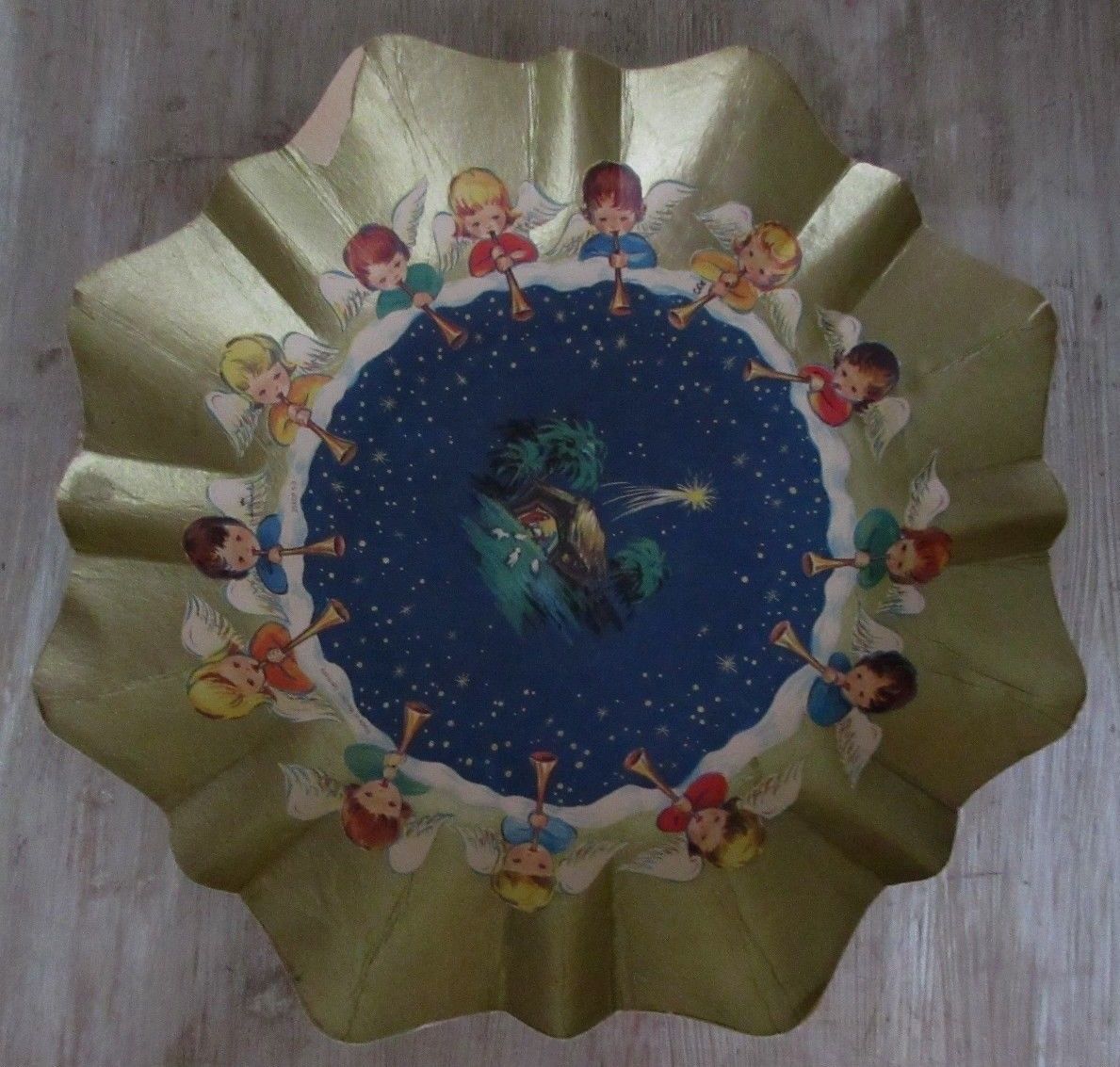 Title (ebay affiliate link): Vintage Christmas Paper Mache Bowl Angels Horn Nativity Made in West Germany