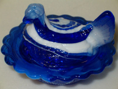 COBALT MILK SLAG GLASS HEN CHICKEN ON NEST BASKET DISH