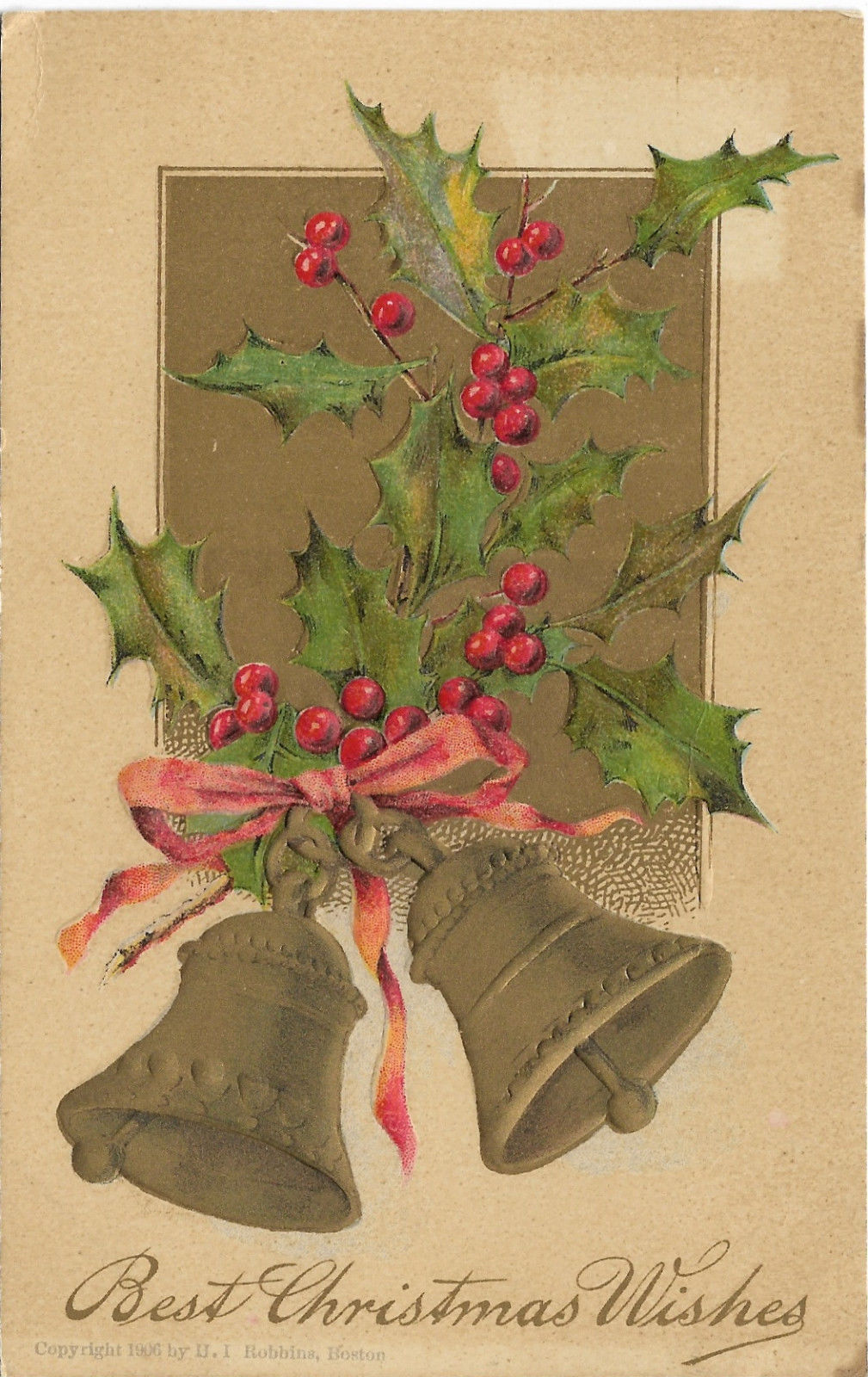 DB embossed postcard c1908, H.I. Robina. holly and gold bells , best wishes