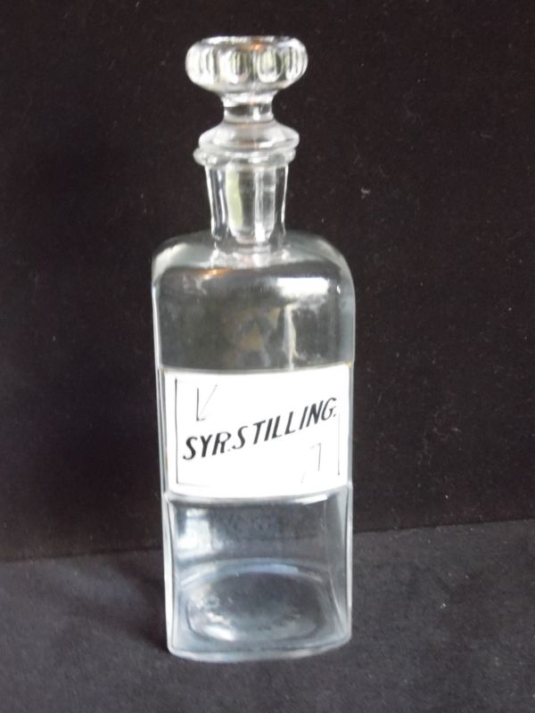 Title (ebay affiliate link): 9" Tall Apothecary Clear Glass Bottle Syr.Stilling With Stopper Pat'' March 1892