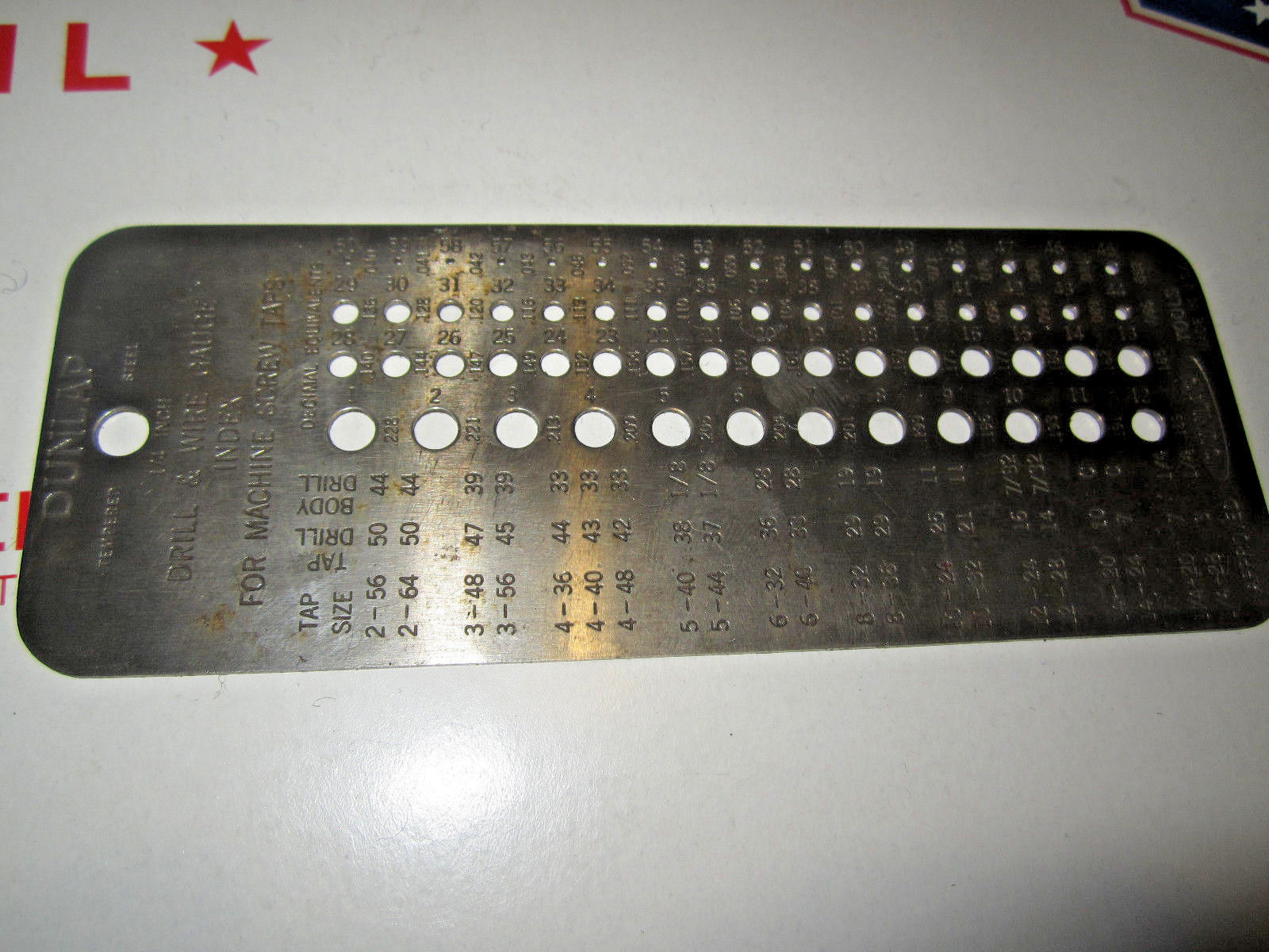 VINTAGE DUNLAP TOOL CO. 1/4" DRILL & WIRE GAUGE INDEX FOR MACHINE SCREW TAPS .