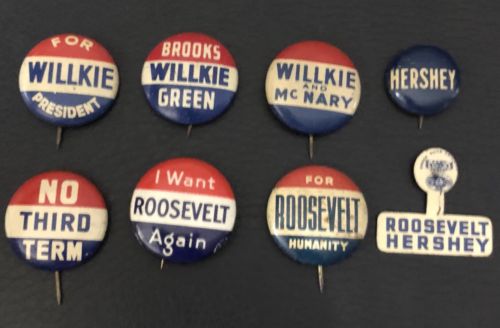 Lot Of (7) Willkie, McNary, Brooks, Green, Roosevelt, Hershey Pins & (1) Tab