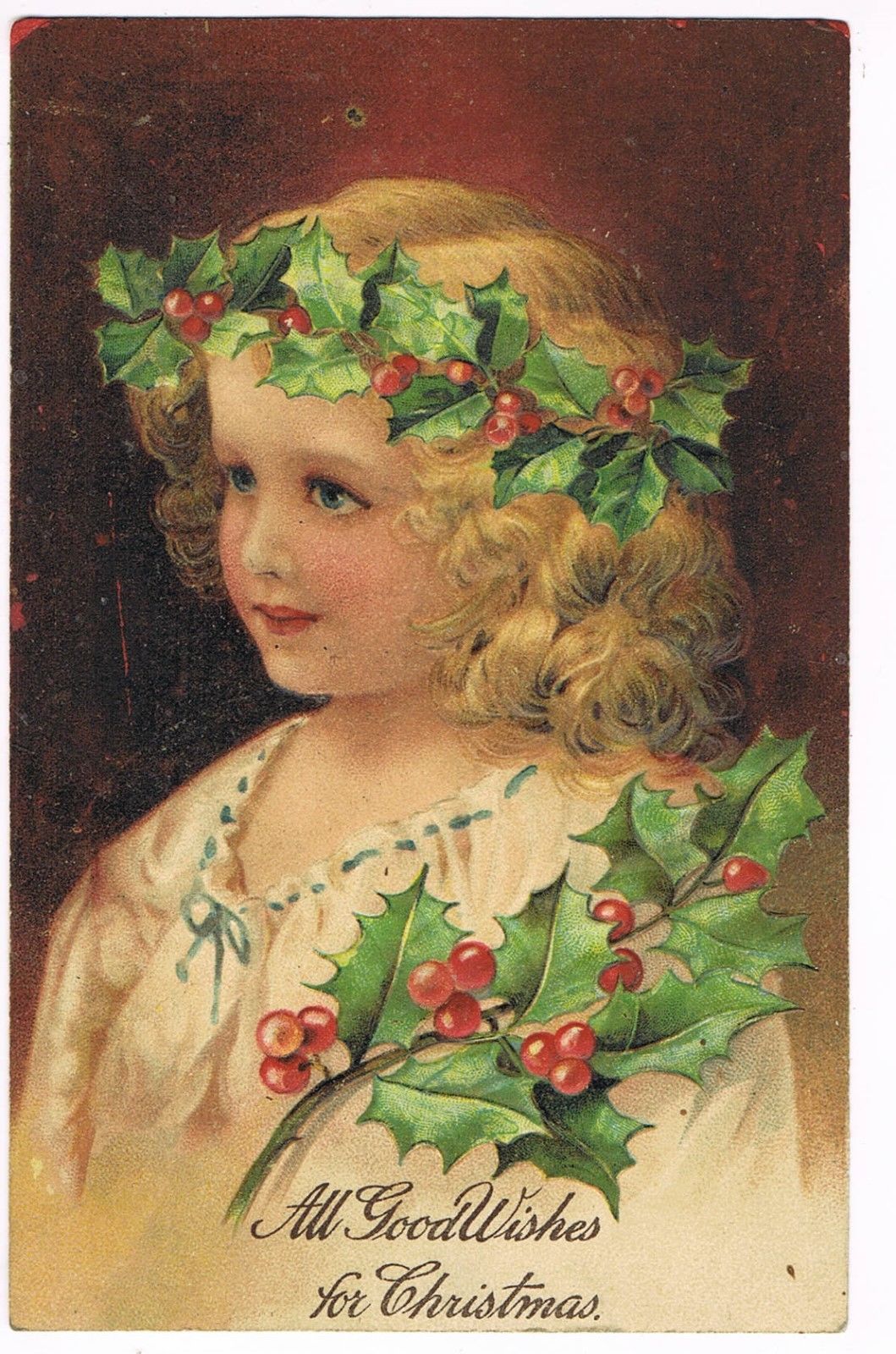 Title (ebay affiliate link): ANTIQUE EMBOSSED CHRISTMAS Postcard YOUNG GIRL, BLUE EYES, HOLLY CROWN