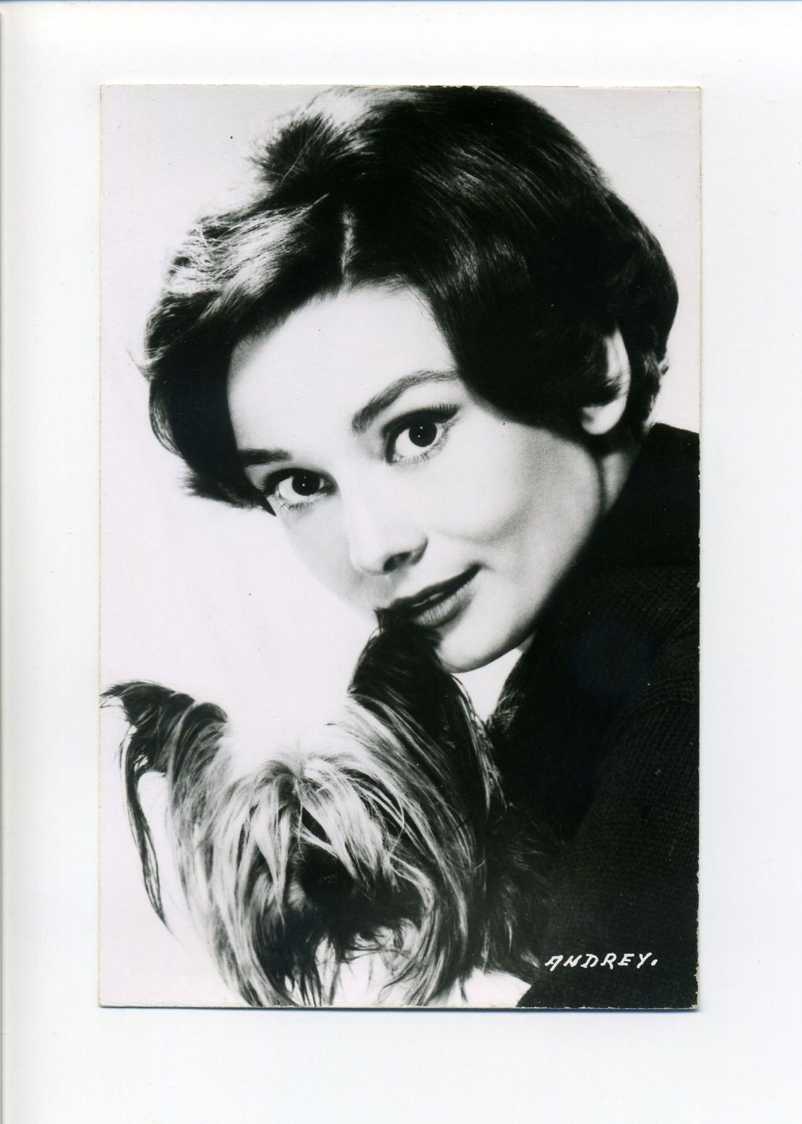 Title (ebay affiliate link): Audrey Hepburn with terrier, RPPC real photo, vintage postcard