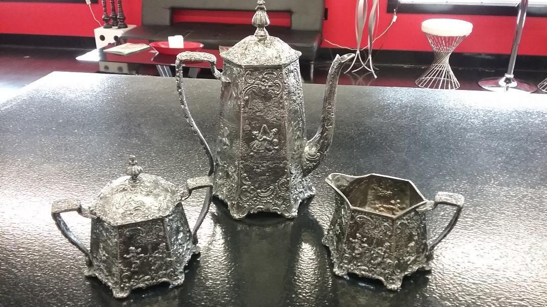 Title (ebay affiliate link): Antique W.B. Mfg Co. Weidlich Bros 3 piece Coffee Tea Set Dutch Scenes