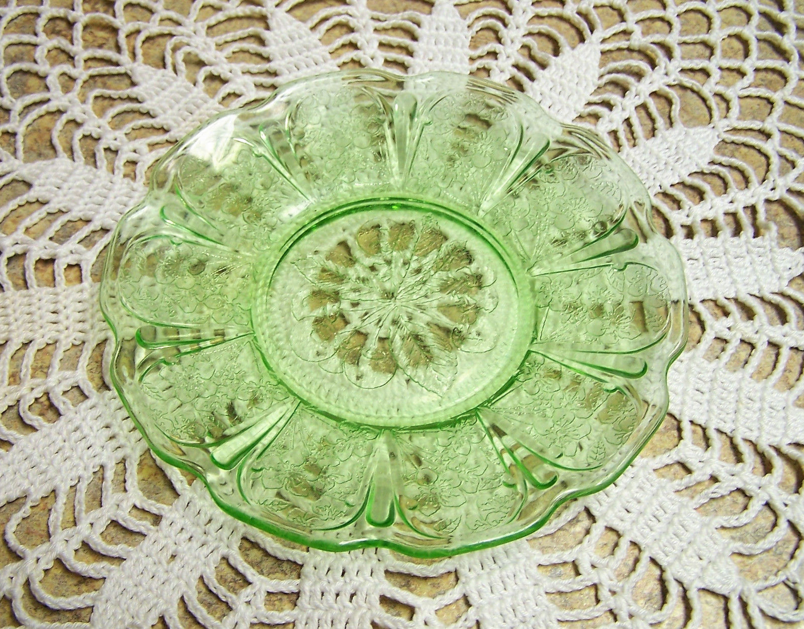 Title (ebay affiliate link): Vintage Green Depression Glass Saucer/Plate Cherry & Blossoms Pattern 6"