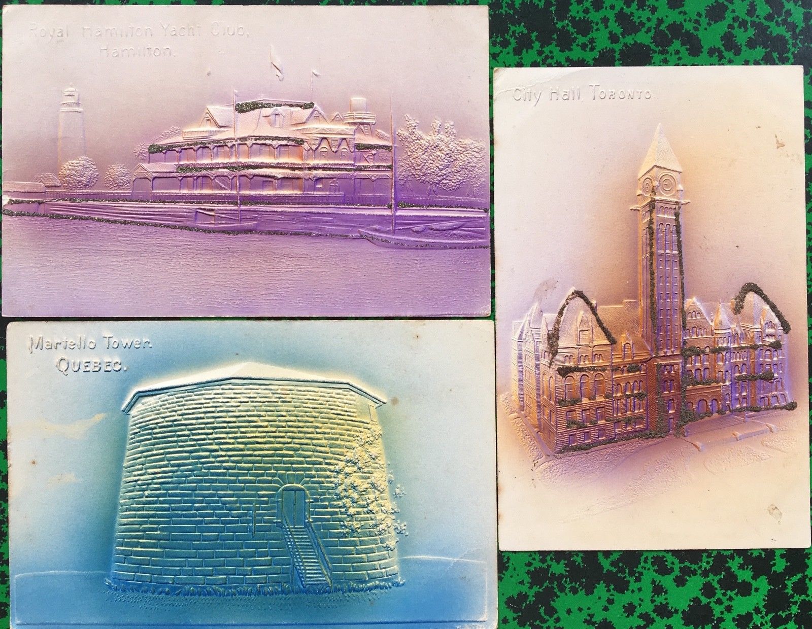 Title (ebay affiliate link): 3 early blind embossed postcards: QUEBEC, HAMILTON YACHT CLUB, TORONTO CITY HALL