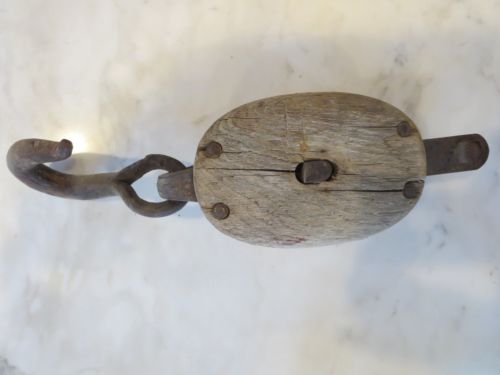 Title (ebay affiliate link): Antique Vintage Iron Wood Barn Pulley Block and Tackle Pulley w/ hook