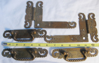 Title (ebay affiliate link): ANTIQUE FURNITURE HARDWARE 3 BRASS DOOR PULLS 2 HINGES