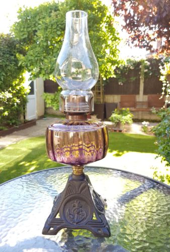 Title (ebay affiliate link): Antique Queen Anne Oil Lamp With Amethyst Glass Font & Cast Base