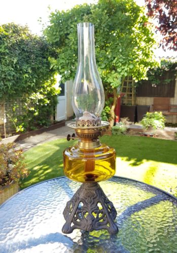Title (ebay affiliate link): Antique Oil Lamp With Amber Glass Font And Cast base