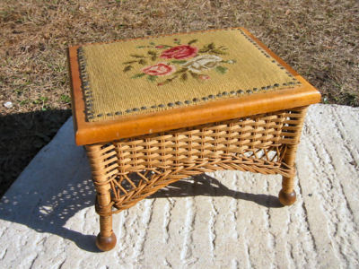 ANTIQUE NEEDLEPOINT FOOTSTOOL - WICKER