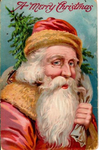 Title (ebay affiliate link): Old Man Santa Claus with gentle face, Tree and Pack. Unposted German Postcard