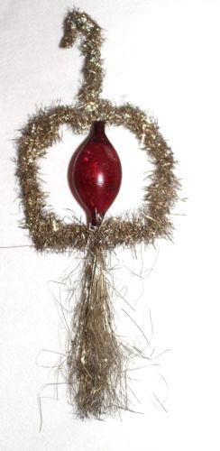 Title (ebay affiliate link): Early 1900s Silver Tinsel Oval, with Red Oval Bead inside. German ornament.
