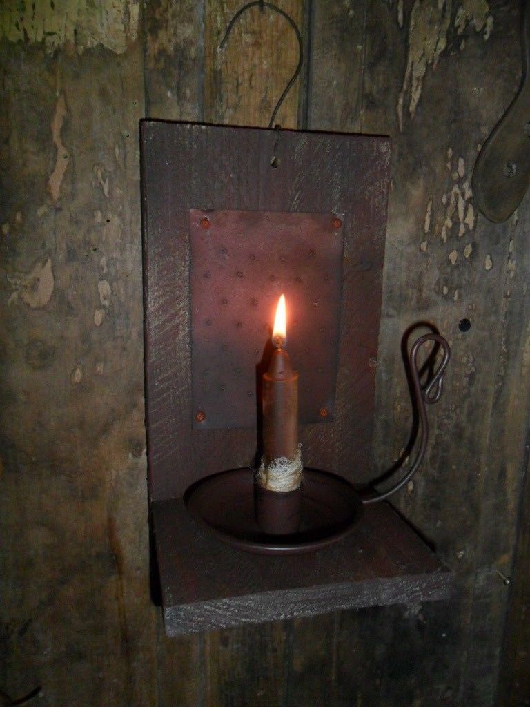 Title (ebay affiliate link): Primitive Homestead Lighting, Early Look Wall Rack, Punched Tin Reflector,Candle