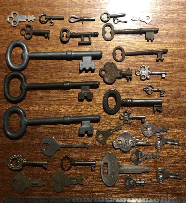 Title (ebay affiliate link): Antique Vintage Lot of 30 Keys Brass Skeleton Furniture Barrel Key Cabinet Clock