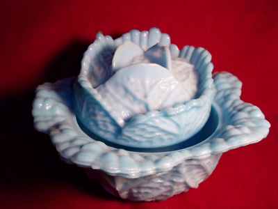 BLUE MILK GLASS CABBAGE SHAPE COVERED DISH VALLERYSTAHL