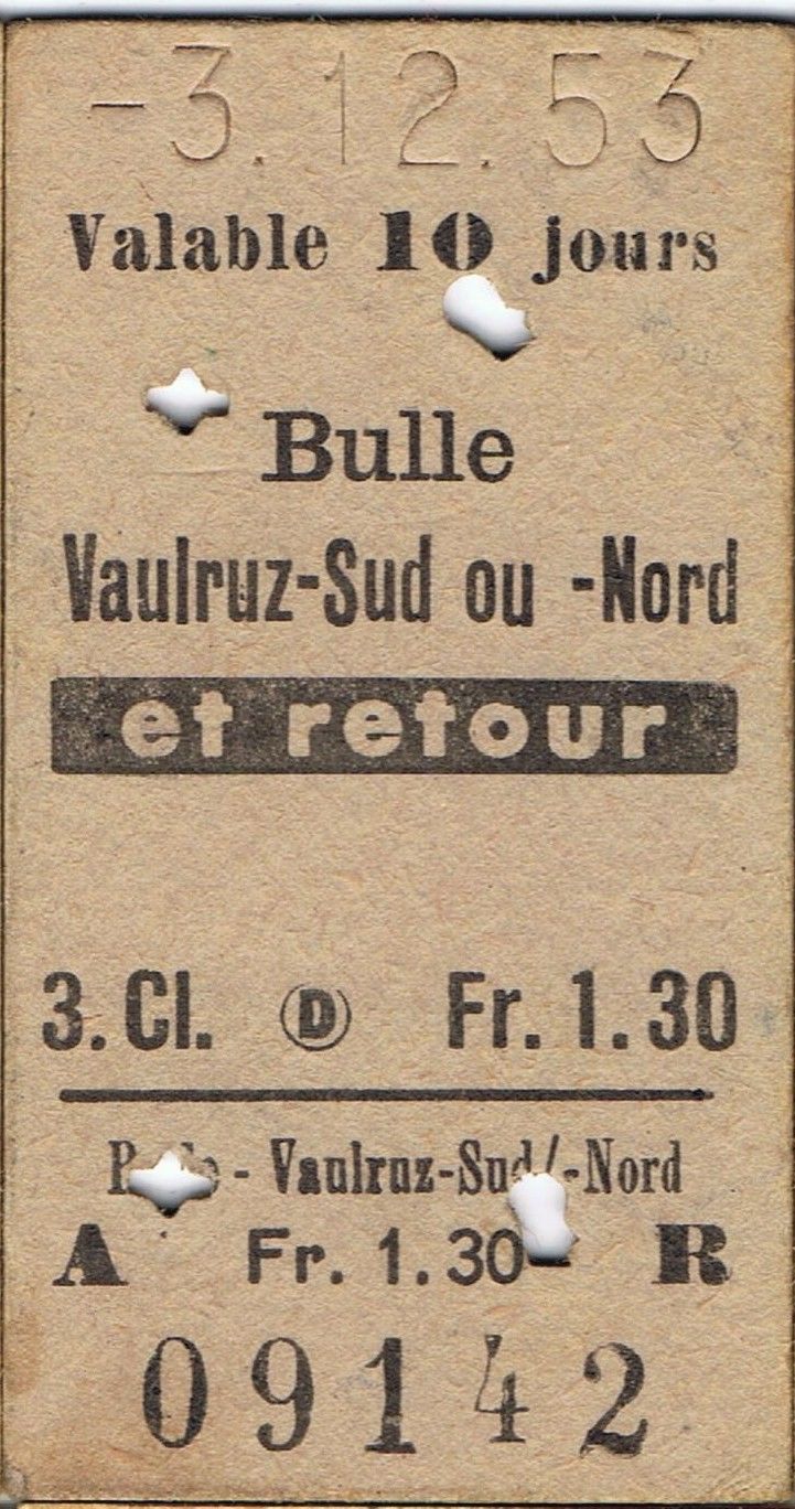 Railway tickets Switzerland Bulle to Vaulrez South or North third class 1953