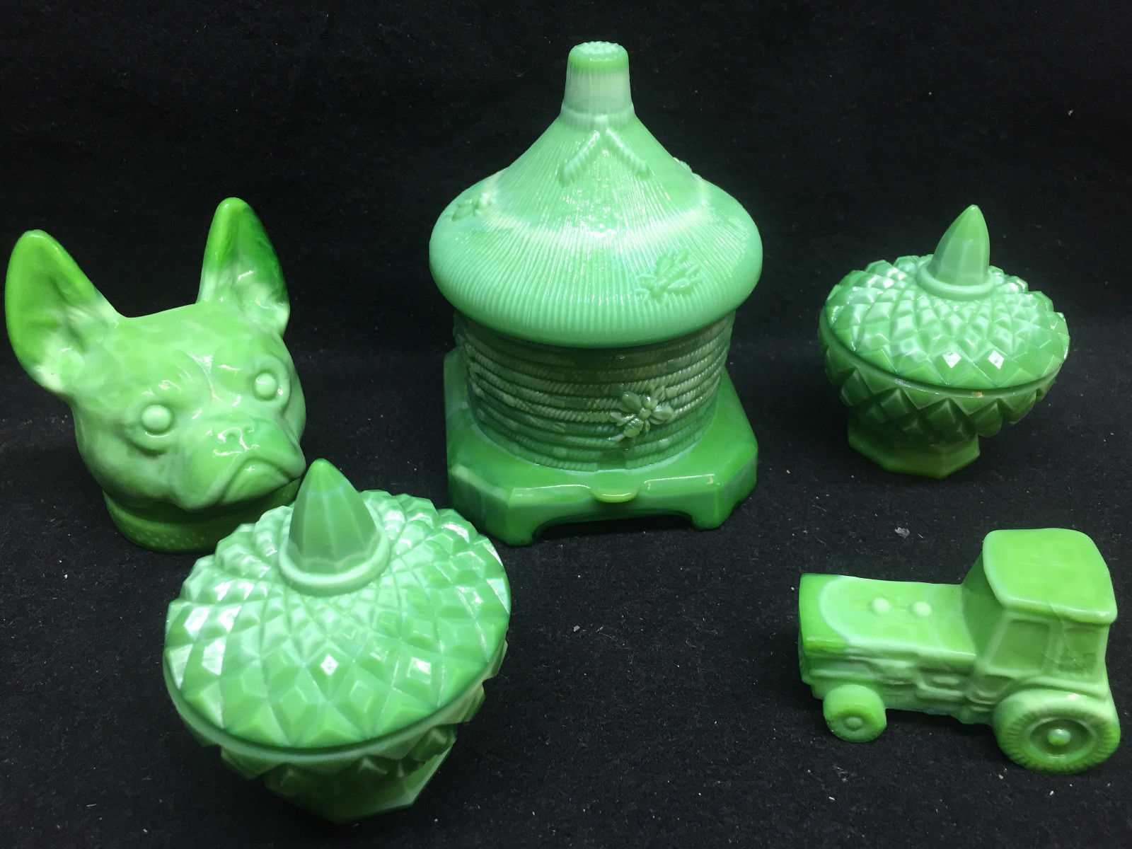 lot Jadeite Green Milk glass candy dish slag Honey pot jar frog bulldog tractor