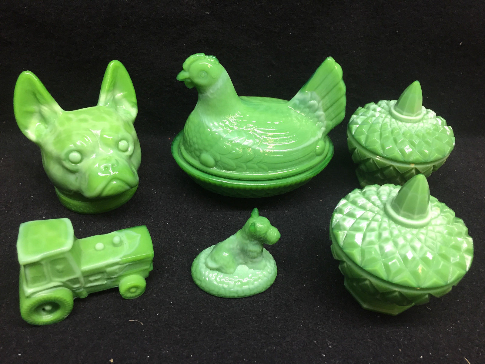 lot Jadeite Green Milk glass slag bulldog tractor hen on nest candy dish mustard