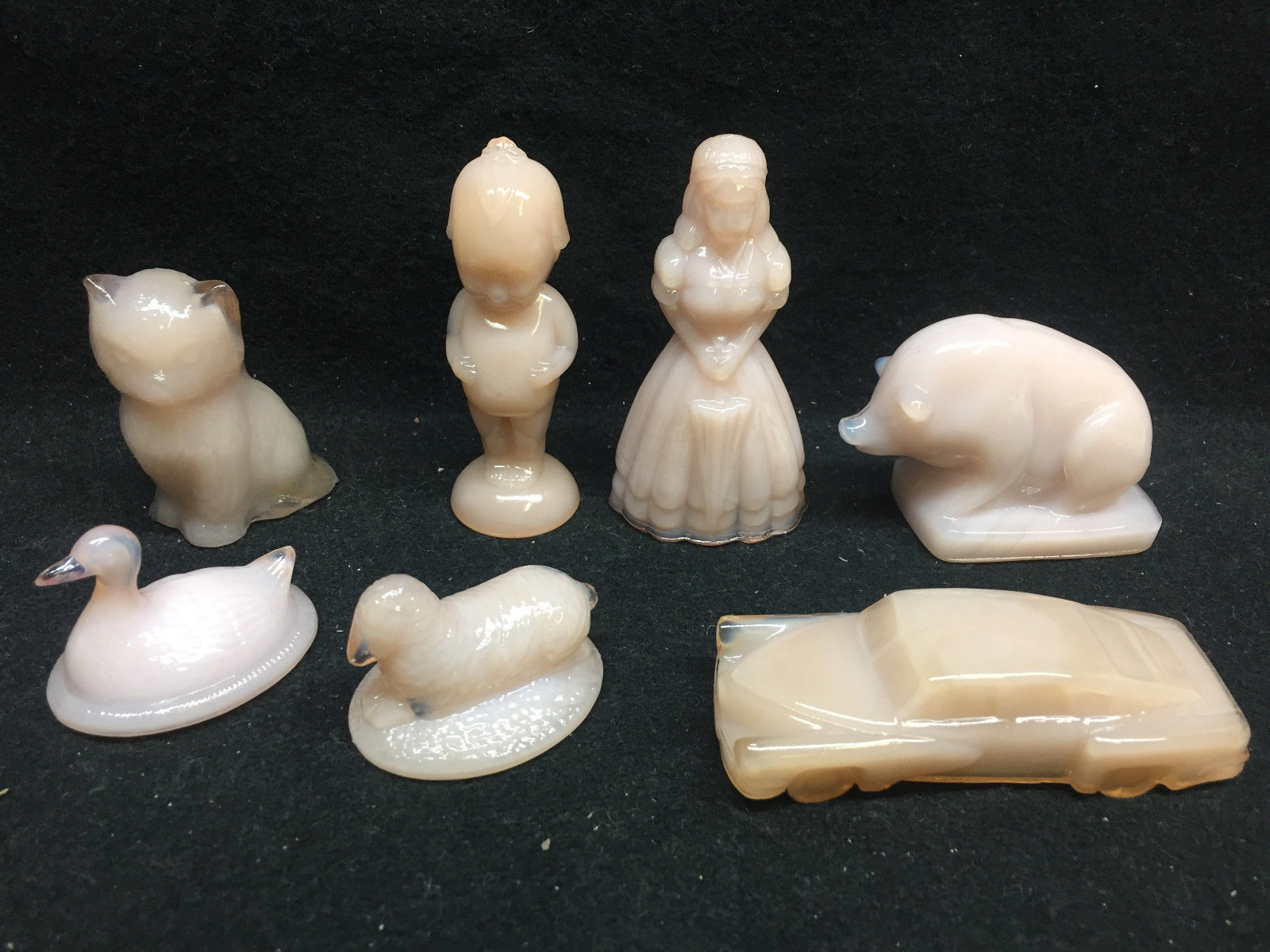 Crown Tuscan Pink Milk glass Kewpie Jennifer Doll tucker car pig cat duck sheep