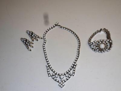 Vintage Silver Plated White Milk Glass Necklace, Bracelet & Clip On Earring Set