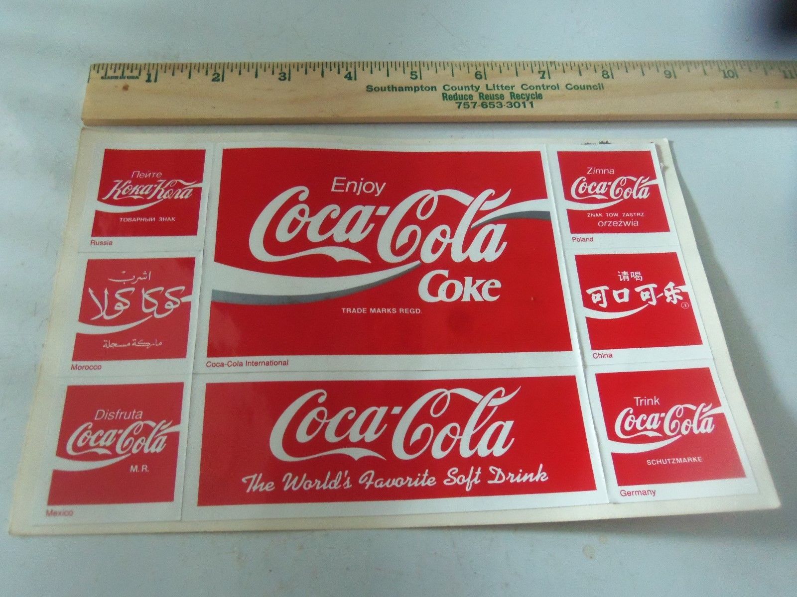 Title (ebay affiliate link): Lot of 8 Vintage Coca Cola Stickers - New / Old Stock Different Languages